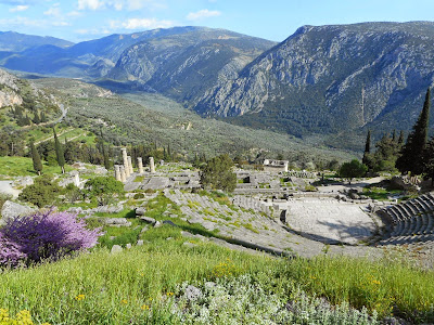 La vue en haut du théâtre sur le temple d'Apollon et les montagnes.